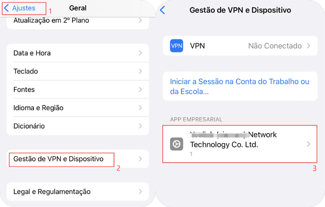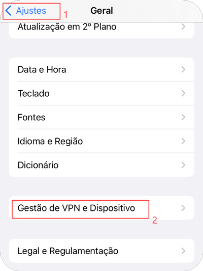 Vá para Configurações > Geral > VPN e gerenciamento de dispositivos e selecione a opção AnyGo. Se você não encontrou o portal VPN através das etapas "Configurações" > "Geral" > "VPN e gerenciamento de dispositivos", reinicie as "Configurações" e tente novamente.